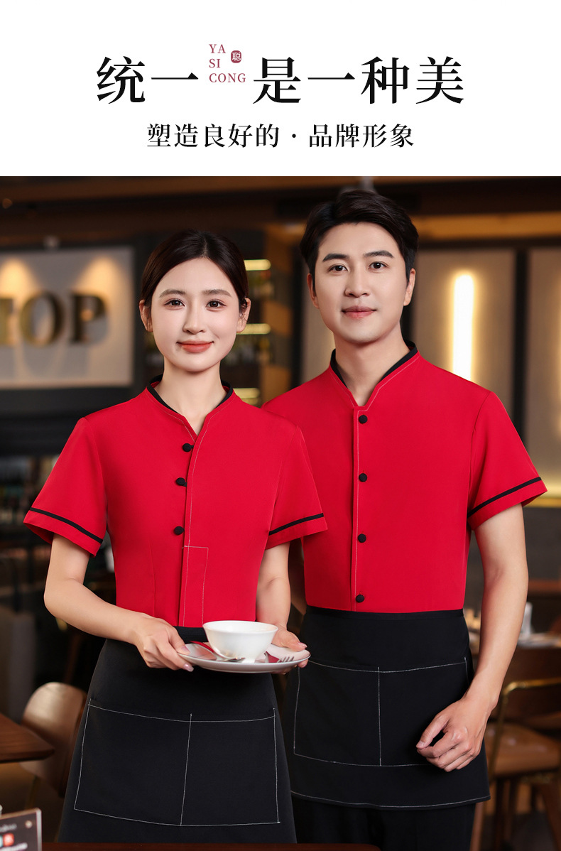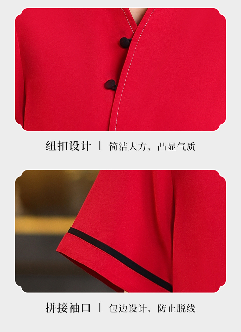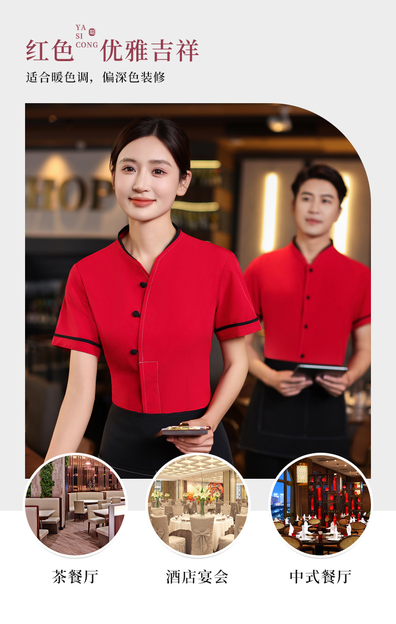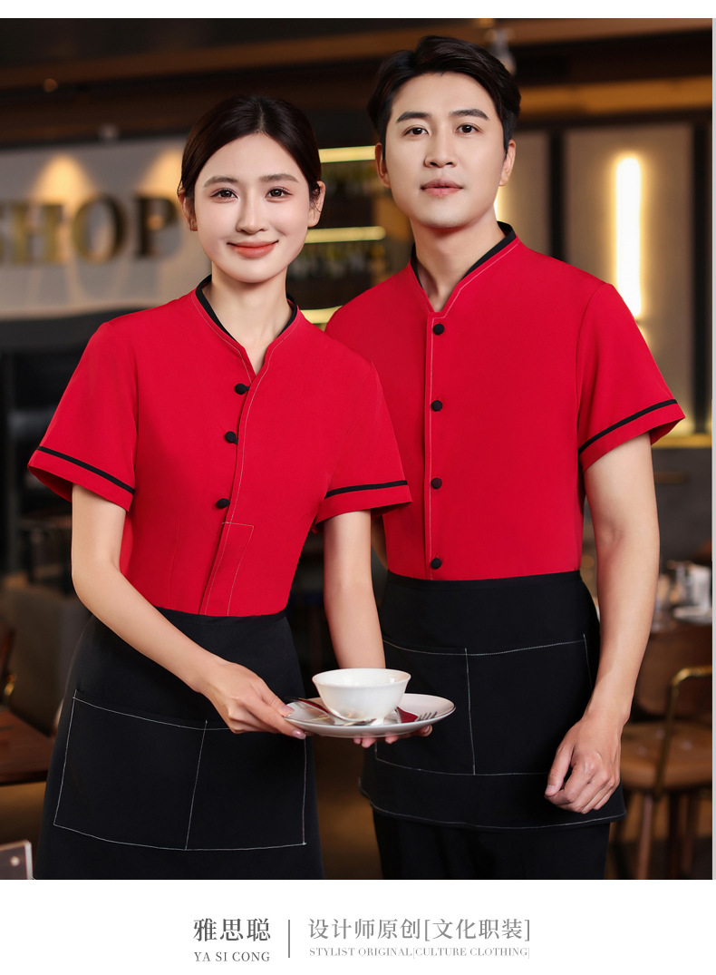 เสื้อฟอร์มพนักงานร้านอาหารกาแฟโรงแรม แขนสั้นผ้าฝ้ายคอจีน F6805005 ดำ แดง M-4XL