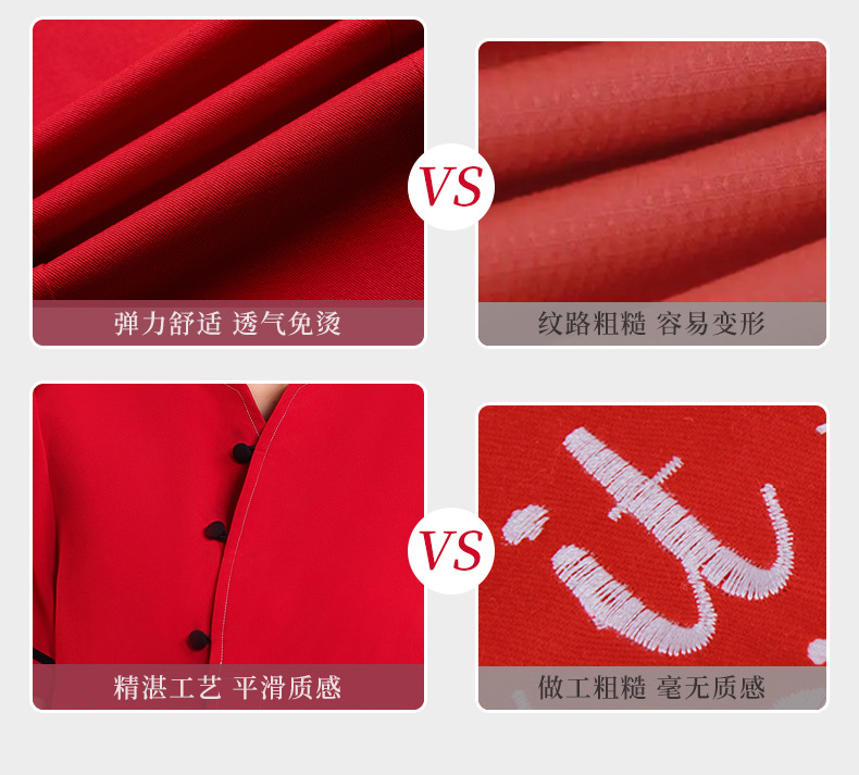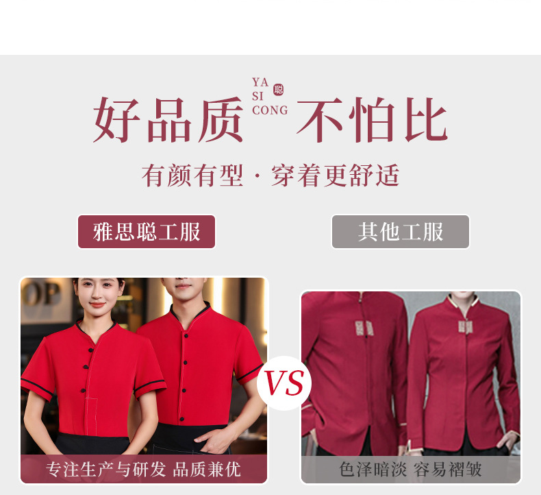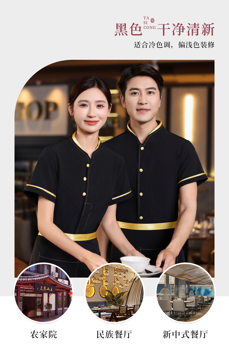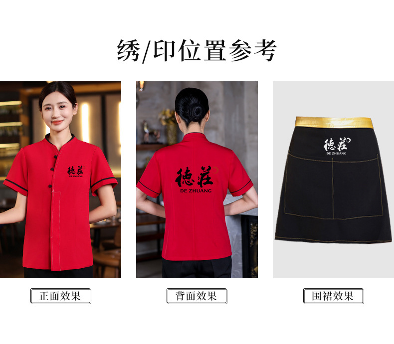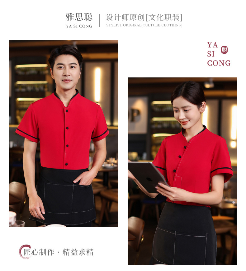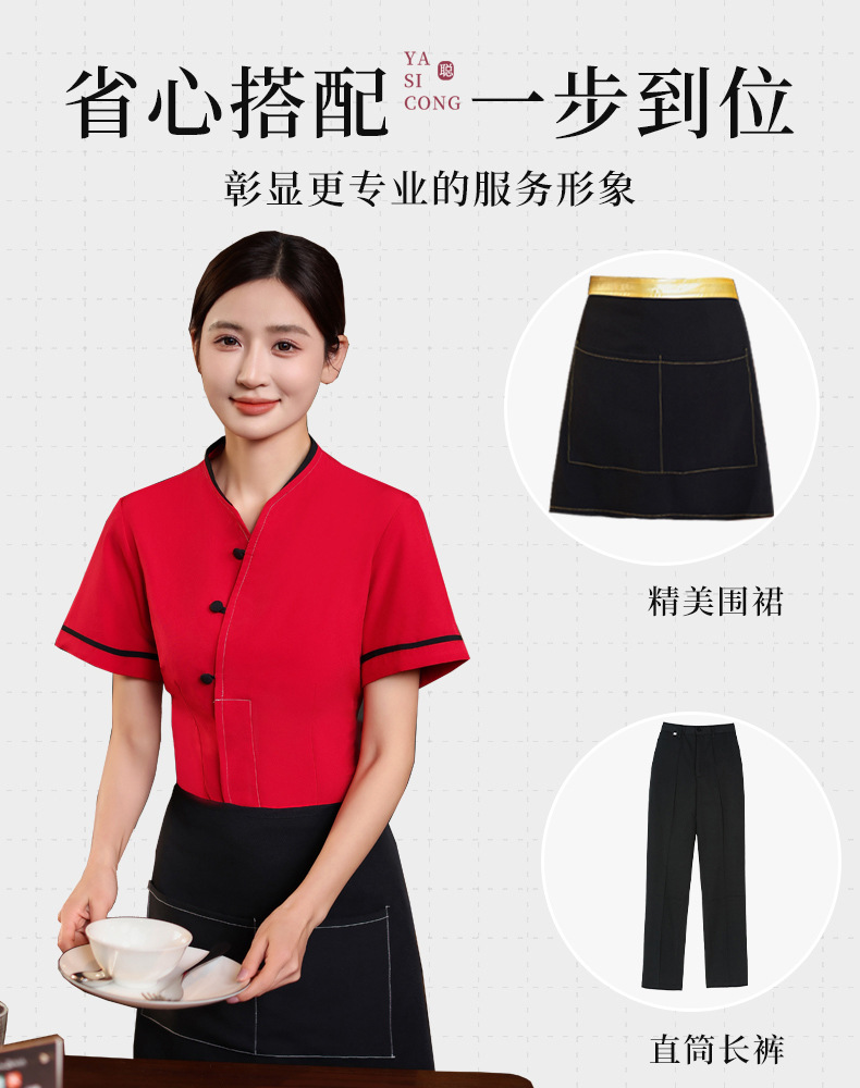 เสื้อฟอร์มพนักงานร้านอาหารกาแฟโรงแรม แขนสั้นผ้าฝ้ายคอจีน F6805005 ดำ แดง M-4XL
